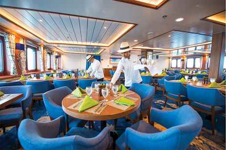 Forward lounge and bar accommodating all guests for presentations and gatherings, restaurant, large library with Mac kiosks, open-air observation deck, underwater gear area and dual Zodiac boarding platform, and “open bridge,” where guests can meet the Captain and officers and learn about navigation.
