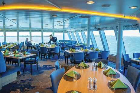 All feature windows or portholes, private facilities, climate controls, and hair dryers, plus Wi-Fi connections and USB ports for mobile devices. Category 4 cabins have step-out balconies. There are six connected cabins.