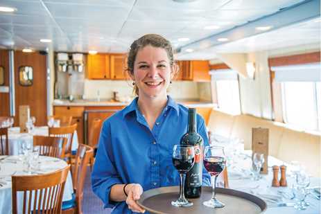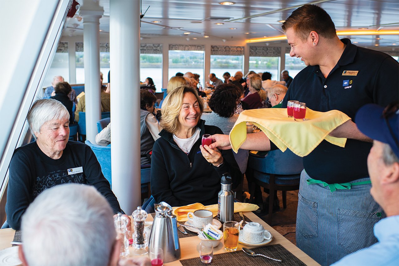 Meals are served in the dining room at a single seating with unassigned tables for an informal atmosphere and easy mingling. Menus feature sustainable choices, local where possible.