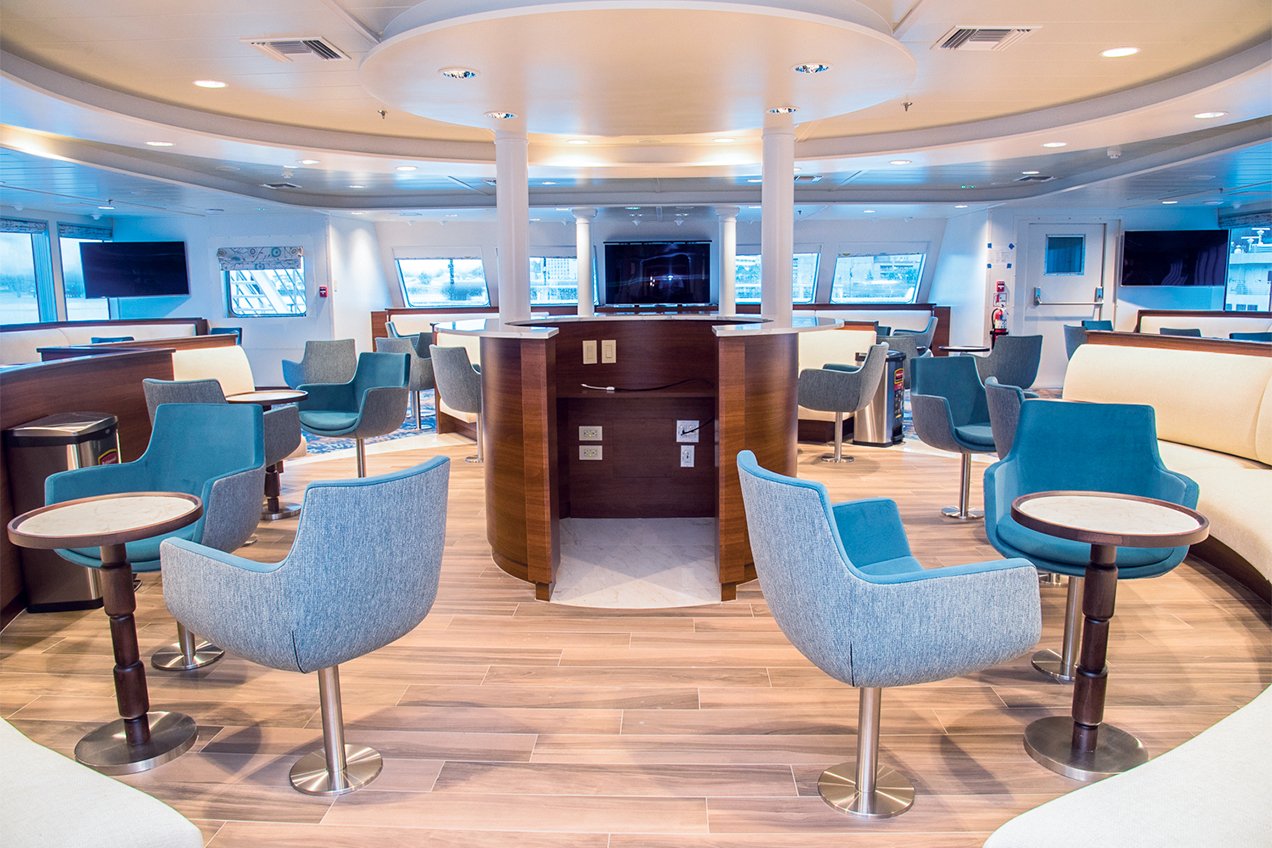 Reception; main dining area; global gallery; fitness center; lounge with full-service bar and state-of-the-art presentation facilities; observation deck; mudroom with lockers for expedition gear; partially-covered furnished sundeck; plus open access to the Bridge, the Captain, officers and on-duty wildlife spotters.