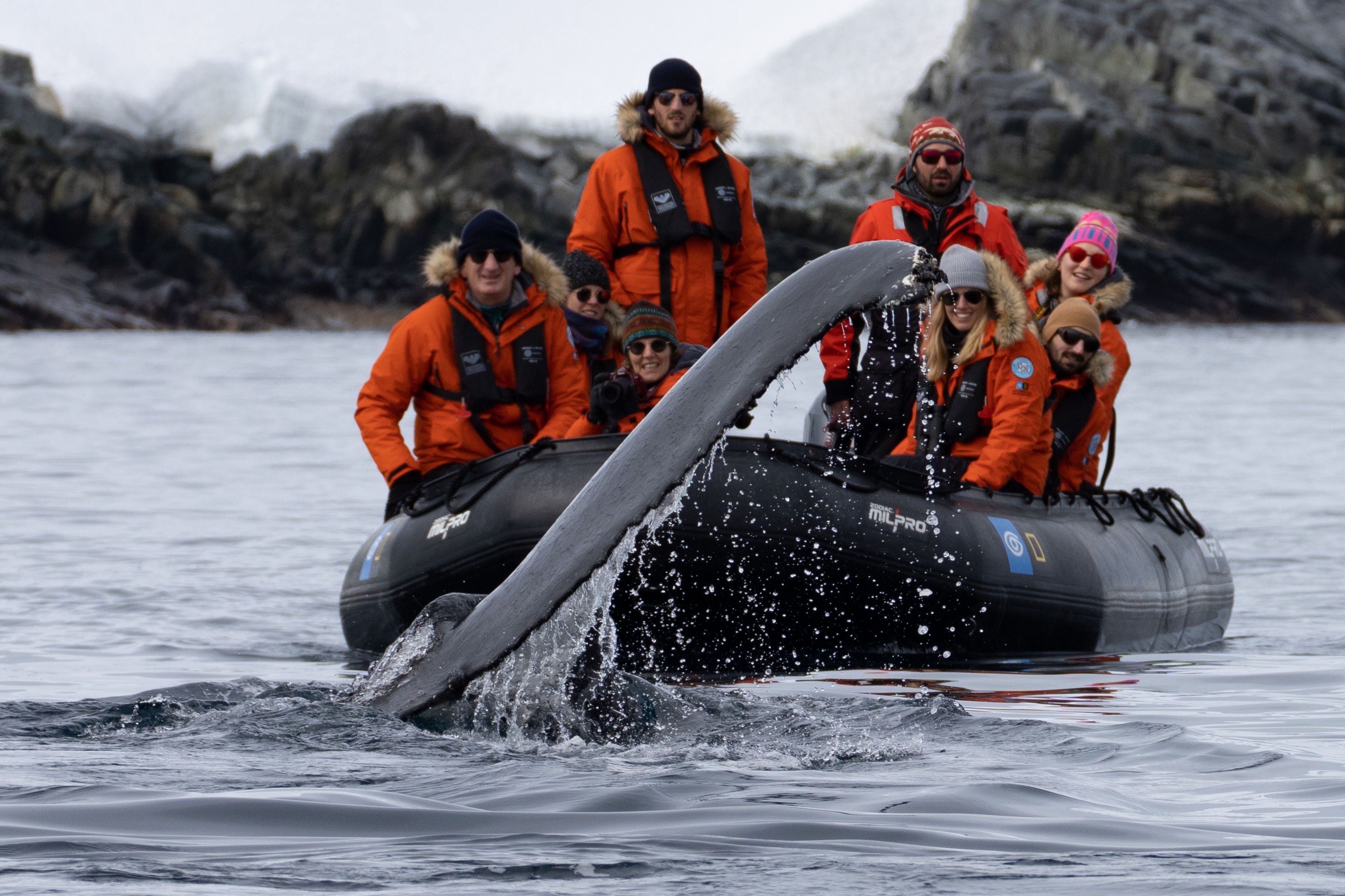 We spotted whales while kayaking around enormous blue icebergs today. As we participated in a thrilling polar plunge in the icy waters of Mikkelsen Harbor, we saw porpoising penguins amidst even more whales. We enjoyed a thrilling Zodiac ride through the narrow cuts of Spert Island, and… can you guess yet? Still more whales! Finally, after a long and magical day, we sailed into the sunset… accompanied by whales, of course.