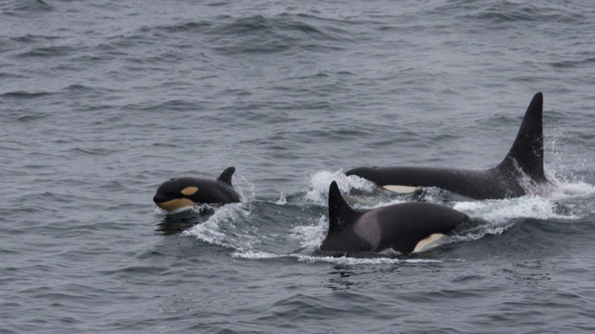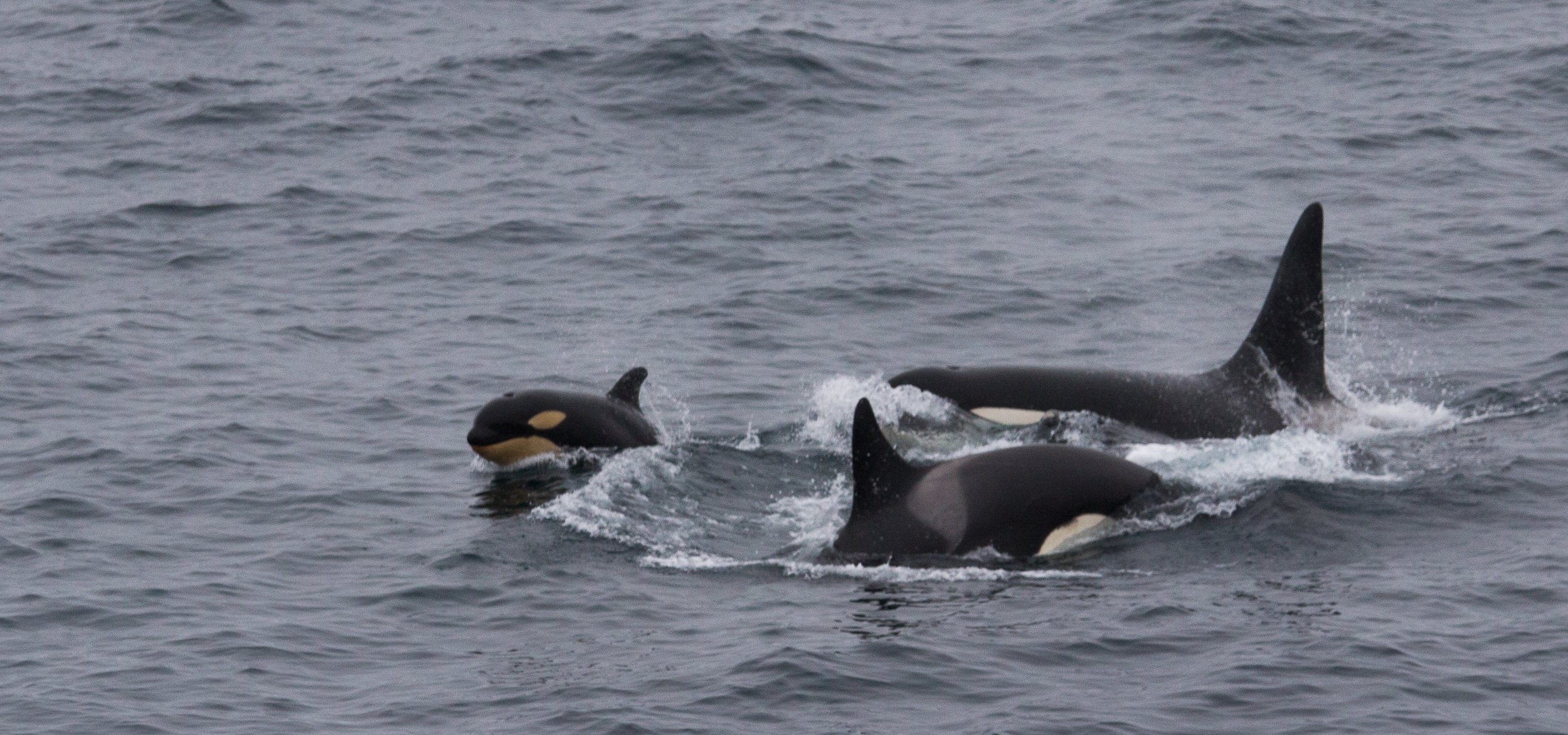 The ship moved on, through beautiful sea ice and fog, steaming towards Greenland. After a Recap from the expedition staff and a delicious dinner with friends, a wildlife surprise! Naturalist Magnus Forsberg found North Atlantic killer whales just off the bow. Though difficult to identify and not well described, the animals we found have dark saddle patches and upward pointing eye patches, tools used to identify specific type. This pod is probably focused on fish-eating, rather than mammal-eating, and travel all over the North Atlantic. Killer Whales hunt in family groups, always following the old matriarch. Males, in fact, though much larger and with a significant and impressive dorsal fin, never leave their mothers. These familial groups have separate dialects, specific diets, and complex hunting patterns and many learned, group-specific behaviors. To see such impressive and beautiful animals in such a remote location was certainly a treat! The whole pod of ~12 animals stuck near the ship for at least an hour, bow riding and hunting as a group.
