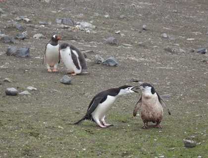 It was interesting that we encountered some different species of sea birds near the ship today compared to yesterday, including penguins feeding far out to sea. Our southerly course took us through several patches of fog during the morning and early afternoon, so we did not know what to expect for a possible landing later in the day once we reached the volcanic islands of the South Shetland Archipelago. We need not have been concerned, however, because when we reached the island group and entered English Strait (between Robert and Greenwich islands), conditions were ideal for making a landing on nearby Aitcho Island. This relatively small island is an important breeding site for both gentoo and chinstrap penguins, and gave us our first chance to observe and photograph and, yes, interact with these most appealing birds. We do our best to avoid getting too close or disturbing them, but they don’t follow the same rules and many of them simply walk right up to us as though they are wondering what or who we are. This visit provided us with great opportunities to learn about animal behaviorisms regarding courtship, nesting, feeding the young, molting, nest maintenance, and other intra- and inter-specific interactions among the penguins (Photo A). This was a very satisfying first stop in Antarctica.