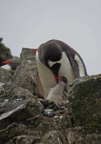 Luckily, we picked up speed in the calm seas and were able to make our first Antarctic landing amongst the Aitcho Islands after dinner! As the zodiacs got closer to land, we could easily hear the squawking of penguins and smell their guano- what a lovely introduction! We all marveled at the abundance of both chinstrap and gentoo penguins that were nesting on this island. Though both of these species were nesting in the same environment, rocky and ice-free slopes, they didn’t intermingle much. In both species, males and females share responsibility of taking care of the chicks. During this excursion we were fortunate enough to see some of the adult penguins feeding their young chicks regurgitated krill. The chicks were adorable! We spent the next hour watching the courting and nesting behaviors of these species and even saw some skuas circling the colonies looking for a meal. Carefully avoiding penguin highways, we hiked to the other side of the small island where we saw our first land mammal - a southern elephant seal, the largest seal in the world! Though the individuals we saw were not fully grown, they still dwarfed the surrounding penguins. We all returned to the ship ready to enjoy a night of calm seas dreaming of penguins.