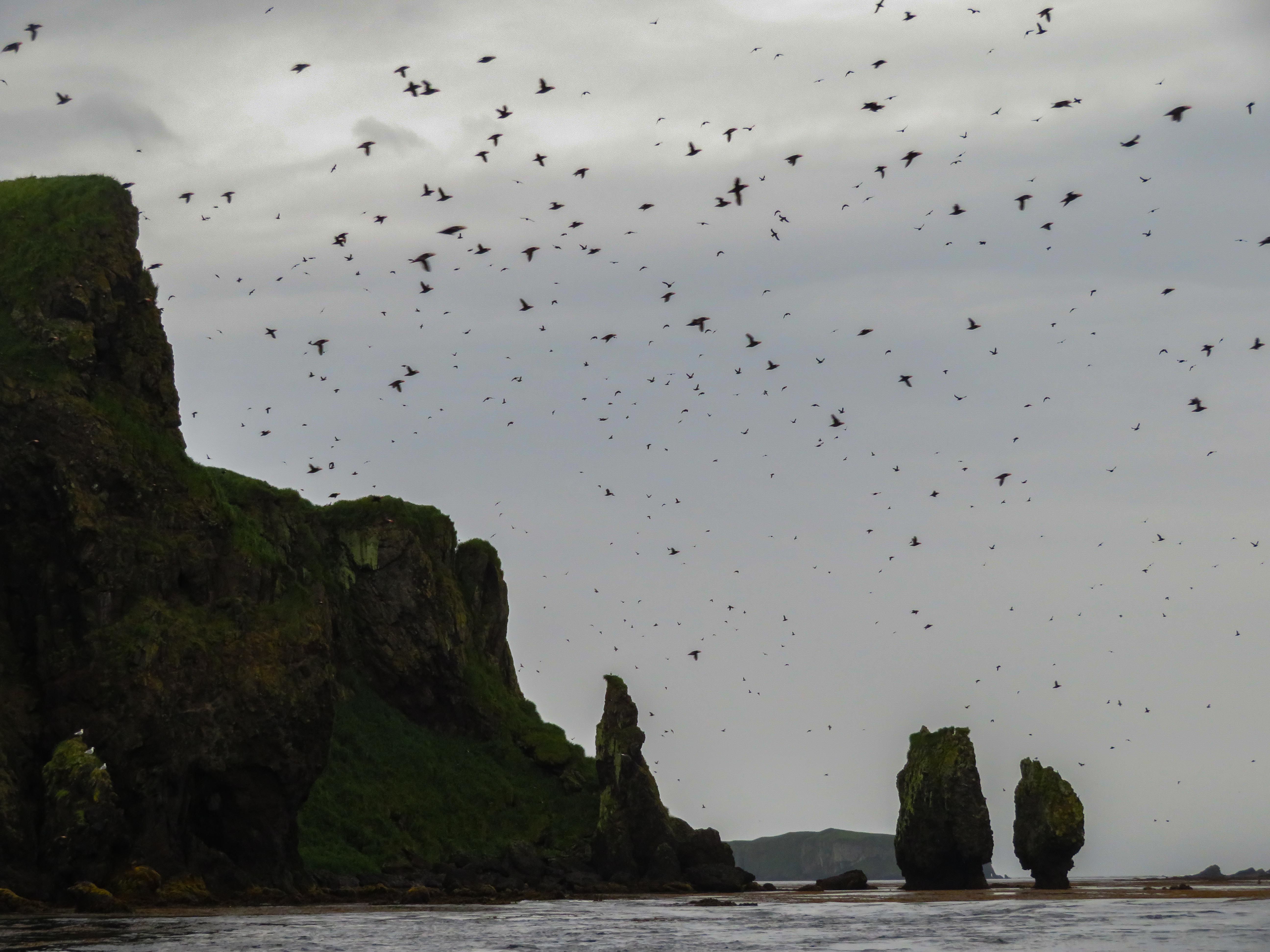 Dawn found National Geographic Orion nearing the Baby Islands: a small archipelago of, yes, small islands near Unalga Island in the Fox Islands group of the Aleutian Islands. These low, rocky islands are the nesting sites of thousands of seabirds such as tufted puffins and whiskered auklets. The range of whiskered auklets’ range in North America is limited to only about ten islands on the Aleutian Chain and we were lucky to see small flocks of them flying and on the water here. On Zodiac excursions here were surrounded by tufted puffins—thousands of them.