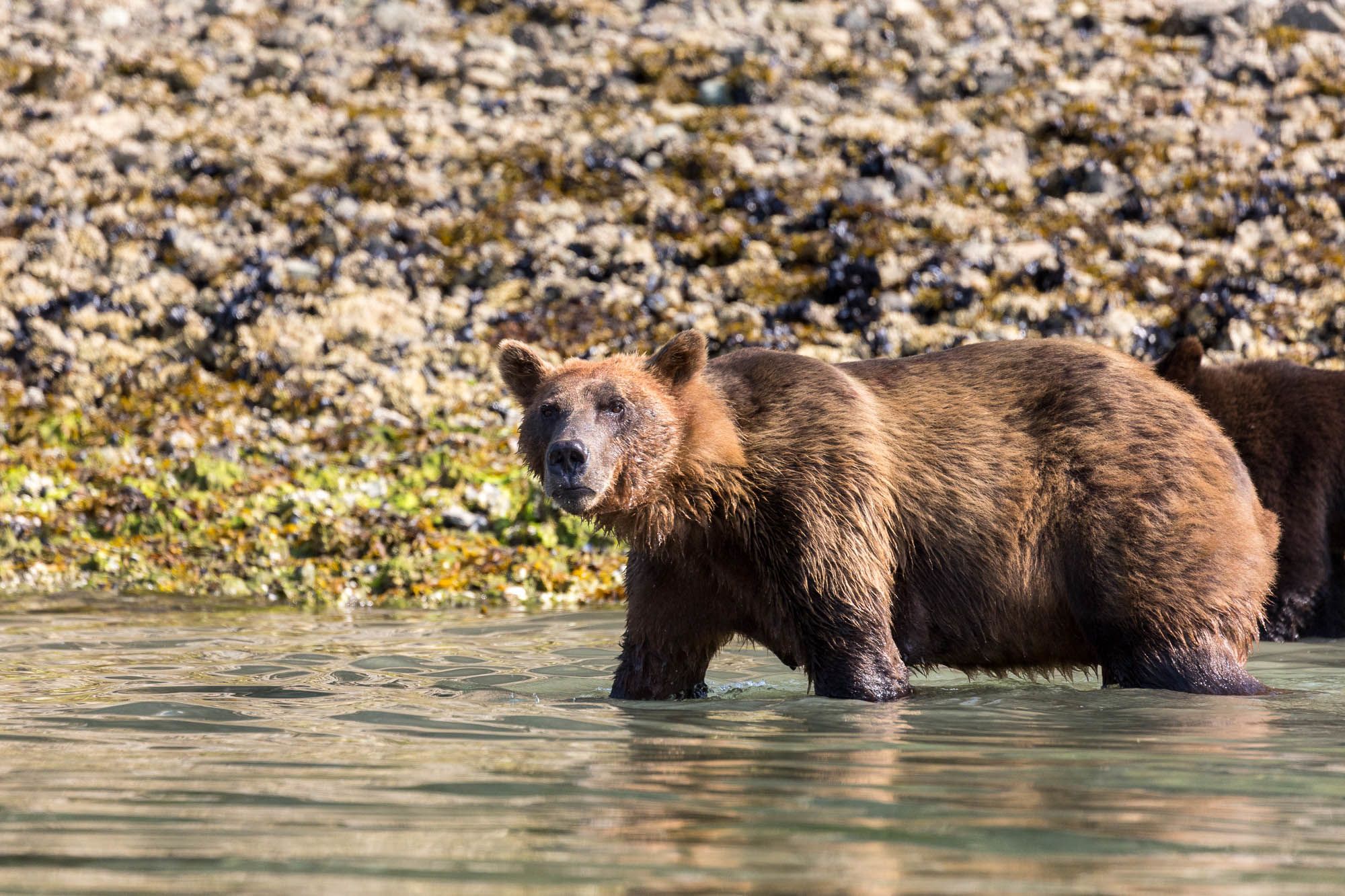 Zodiacs set off for two rounds of cruises among the myriad of small islands that make up this magnificent harbor. We quickly found brown bears in the water, poking among the rocks, and perusing the shoreline in search of food. The tide was out, the table was set, and bears were there to feast on the tidal bounty. We found many females and their cubs exploring the tidal zone while other bears were moving along the shoreline.