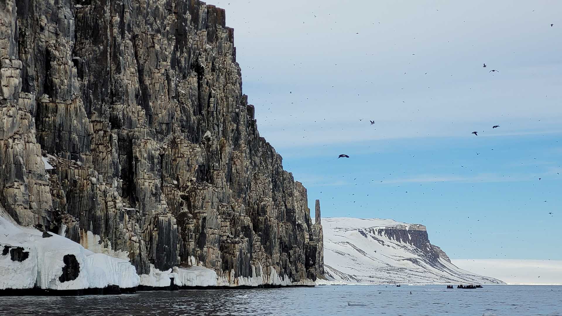 Today we experienced Svalbard at its absolute finest. The day started with National Geographic Endurance positioned just off the magnificent seabird nesting cliffs named Alkefjellet, or Auk Mountain. These stunning cliffs, composed mostly of dolerite, serve as home to over 100,000 breeding pairs of Brünich’s guillemots, tens of thousands of kittiwakes, and several other nesting seabird species. Brünich’s guillemots, a slightly less charismatic relative of the puffin, lined nearly every available narrow ledge. This is where they will lay their single precious egg and raise their chick. The activity around the cliffs and in the waters nearby paints a slightly overwhelming and chaotic scene. We were graced with perfect weather, which afforded us the rare opportunity to get a close glimpse of this magnificent scene from our Zodiacs.