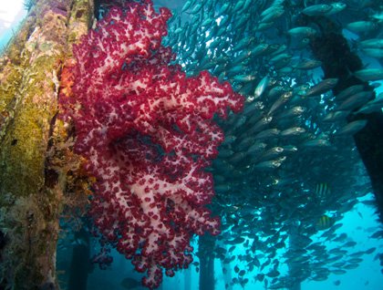 We donned our skintight tiger suits and underwater adaptations and dropped into an unbelievable fairytale world of colours and forms that was at once mesmerizing, enchanting and fathomless. Feather stars did their best to impress upon us that one did not need to fly to use delicate wings to catch nutrients on underwater currents. Softer corals of vibrant colours such as gorgonians drew new fans who gazed in awe at her sprawling, artistic branching structures. A banded sea krait spiraled into view and paddle tailed to breathe at the surface – as inquisitive of us as we were of it. An octopus was spied shape-shifting into corally crevices, releasing its identity, then morphing into an algae covered rock before fading into the inky blue depths below.