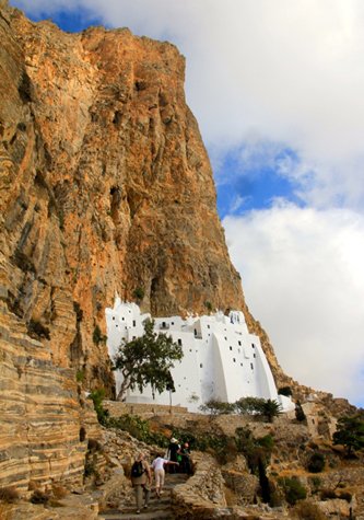 As we reached the end of this dramatic road of cliffs with the endless blue of the Aegean below us, we suddenly noticed hanging off the rocks a white monastery that looked like a white egg of an eagle! This site, the way it was constructed is just a wonder of architecture, of human will! Some of us could simply not resist but to climb these 365 steps that led towards a heaven of photography and vision!