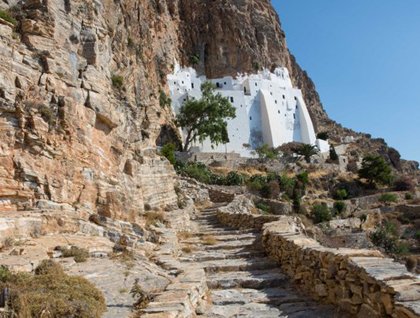 Soon we crossed over to the eastern part of the island where the scenery became even more dramatic, with precipitous limestone cliffs rolling down to the endless blue of the Aegean. Amorgos is cliff and sun, hardship and smile, storm and joviality… But where was the monastery, we could still not see it... and suddenly nesting at the foot of grim craggy towering cliffs, the dazzling white monastery gleams like a dragon’s egg. It is visible only from the sea, hanging like a white painting between the sea and the sky! It is dedicated to Panagia, the Virgin Mary and it is named Chozoviotisa, as the icon floated all the way from Chozova of Palestine to Amorgos, according to the tradition. The monastery dates to 1088 and it is a very important pilgrimage site up until this very day. The 300 steps are nothing and doesn’t stop visitors and us from climbing up to it.