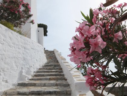 The second group with me, Elli, went to monastery, but without the intension to go up the 300 steps. We stopped to the parking area from where we could enjoy the wonderful views of the wild setting. To see a monastery “hanging” from the steep rocks was unexpected. How could they ever build such a church there? The unlimited blue of the seas and the sky together with the gray rocks and the green vegetation gave our cameras great opportunities. We heard some historical explanations about the island and the monastery, and then we continued to the Chora.