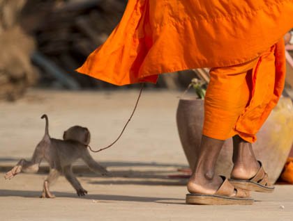 From the heart of the rural settlement we walk to a small local market, and past a secondary school with very chatty young girls eager to practice their English, before returning to the ship via the Angkor Ban Pagoda. This colourful temple is dedicated to Theravada Buddhism, the main religion of contemporary Cambodia. A young monk is walking around with a juvenile pig-tailed macaque on a leash, to the delight of local schoolboys.
