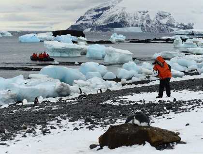 We woke up just as National Geographic Explorer had anchored at Brown Bluff, located on the east side of Tabarin Peninsula. This was our first and only opportunity on this voyage to set foot on the Antarctic continent, and most of the guests chose to do so. Brown Bluff got its name from the brown rocks that dominate the cliffs above the beach. This morning the ground was covered with a thin layer of new-fallen snow, which gave a decorative texture to the landscape. This is an important nesting site for gentoo as well as Adélie penguins. The Adélies start their breeding season before the gentoos, and the majority of penguins onshore were gentoos. We also saw some Antarctic fur seal males and one single Weddell seal hauling out on the beach. A group of crabeater seals and a couple of leopard seals were resting on a small iceberg near the beach. Many of the guests chose to take a Zodiac cruise after the visit on shore and got a great view of the leopard seal.