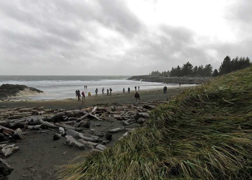 Our afternoon excursion brought us across the great Astoria-Megler Bridge, all 4.1 miles of it, to Washington and the north shore of the Columbia River to visit Cape Disappointment and the Lewis and Clark Interpretive Center. The center is located on a high and precipitous bluff overlooking the Pacific Ocean. A strong wind buffeted the trees—and us—and raised large swells that thundered onto the base of the cliff below. We had a view of Cape Disappointment Lighthouse and white water leapt high up the cliff of dark basalt beneath it. Following a tour of the excellent exhibits here, most of us took a hike on a narrow path through the woods to Waikiki Beach. It was exhilarating to be here on this beautiful beach with the high surf and the strong wind sweeping in from the ocean.