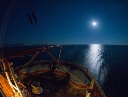We all spent the day finding our favorite spots on the ship, trying to make sense of the constellations of sails and maze of rigging, and hearing our first presentations from our expedition staff. Photographic instructor Max Seigal gave a talk on photographic techniques, and maritime historian Robyn Woodward talked about the exciting field of nautical archaeology and some of the shipwrecks that had been excavated in the region. As expected, when we reached the southern end of the Peloponnesus, the wind completely died so the deck crew went to sail stations to clew up the sails and again scrambled aloft into the rigging to furl the sails for the evening. Captain Pushkarev concluded the day with an introduction to his very proud and capable team of officers, followed by a most impressive Welcome Dinner prepared by chef de cuisine Uwe Poehlmann and his galley team. On to the Ionian Sea tomorrow!