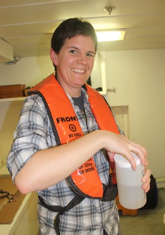 Our morning lectures did begin at 10 a.m. with Eduardo Shaw, speaking on a certain historical hero of Uruguay, Argentina, and Brazil. When his historical talk was finished, most people gathered on the outdoor areas to enjoy the fantastic 73 degree weather, where sun abounds. After lunch oceanographer Deb Goodwin took a plankton tow, a system of ocean sampling that uses a fine mesh net to concentrate the plankton community into a bottle attached at the bottom of the net’s funnel. The natural history staff have been collecting samples as the journey progresses, tracking the difference in pH, salinity, temperature, and species diversity. All of these factors are very closely linked. As ocean temperatures drop, the water becomes denser and can more easily bond to oxygen. With denser, oxygen-rich water, a larger community of planktonic life can be supported. This plankton community is also enhanced by sunlight, which has been prolific in the Southern Ocean (as we are just entering the southern fall). As the ship moves further north the temperature of the water warms. The warmer water is less dense and the molecules are more excited, making it more difficult for them to happily bond to oxygen and thus decreasing the plankton load this part of ocean can carry. Each tow the natural history staff takes shows this difference and change in real-time. As we continue into the warmer waters the guests should continue to find a decrease in overall plankton density and also in diversity of species within the plankton community.