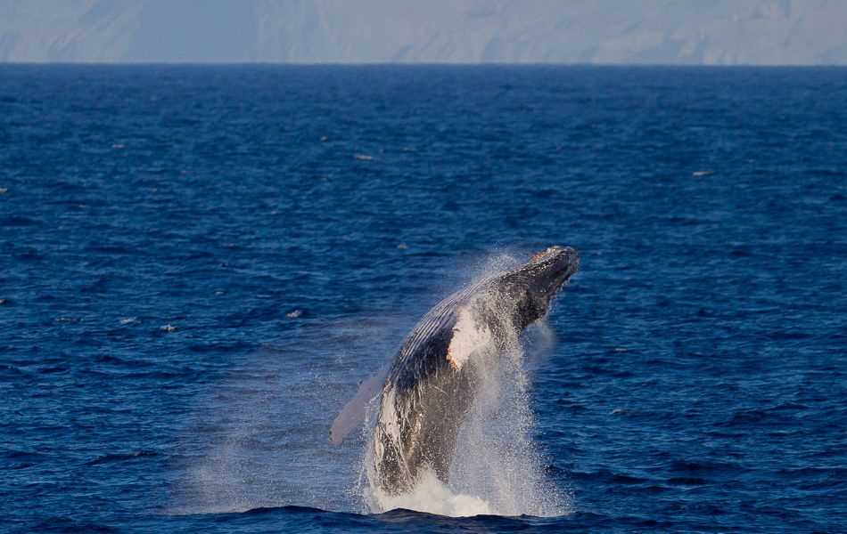 We had many sightings of marine mammals. Early on, we were followed by a pod of long beaked common dolphins, a few California sea lions, and we saw distant whale blows. We saw many humpback whales today. We stopped several times to observe and photograph the amazing behavior that humpback whales displayed today. We saw countless breaches, tail slaps and pectoral fin slaps, some far and some not so far. On one occasion we had a perfectly synchronized double breach, which took most of us by surprise.