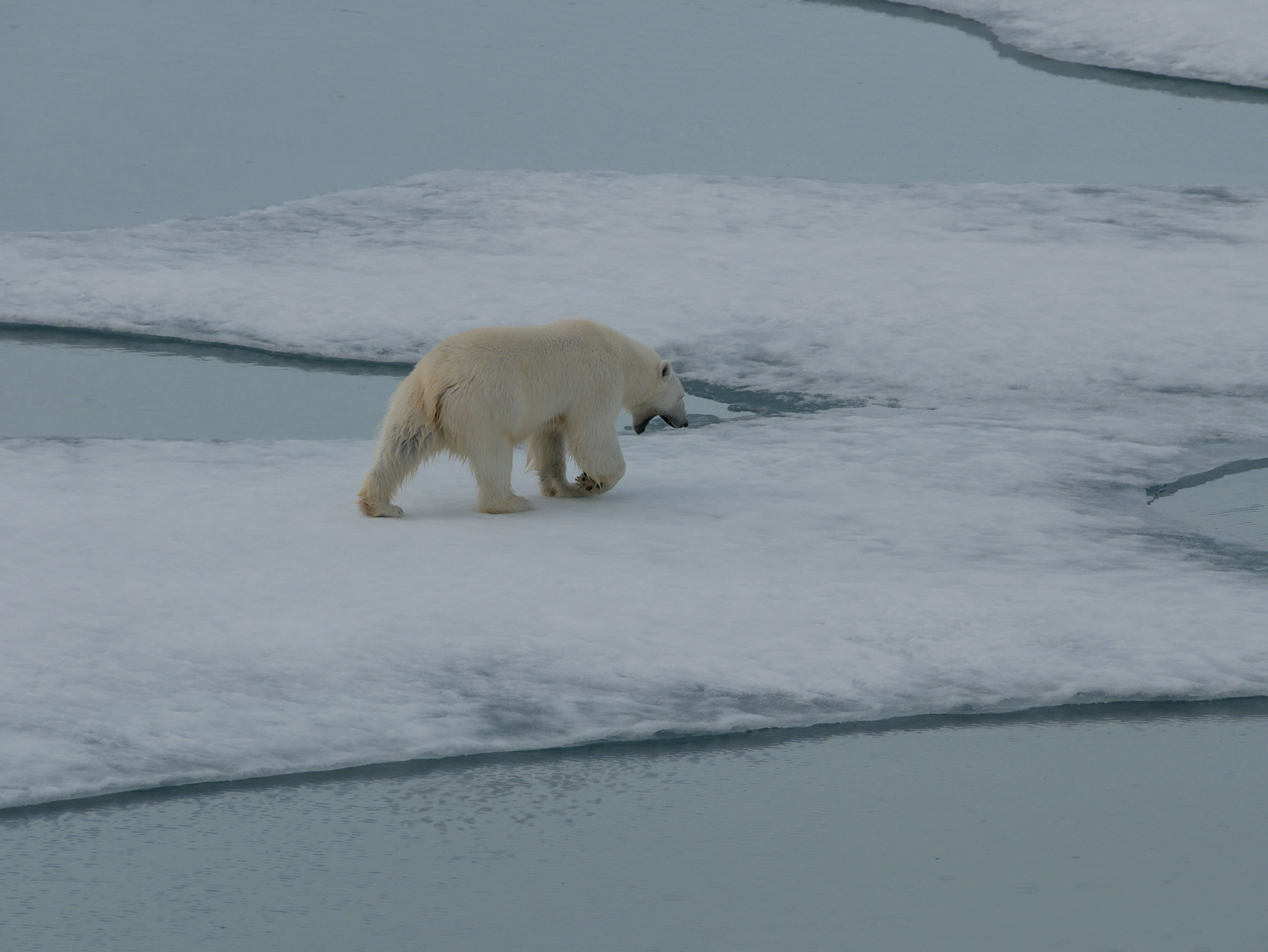 The first bear was spotted as we were finishing breakfast. National Geographic Resolution slowed to a crawl and then stopped, but the bear showed little interest in us and soon wandered away across the ice. The captain soon had us moving again, eager to reach a huge sheet of ice he had been watching for days on the satellite images.