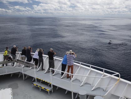 Here in Baja California, it’s always a pleasure to awake to flat calm seas with the stunning Sierra de la Giganta as a backdrop. As National Geographic Sea Bird sailed south towards our morning destination, Isla Danzante in the Bahía de Loreto National Park, eyes on the bridge and bow were scanning for signs of marine life in the first morning light. As the sun rose higher, we began to see flashes and splashes in the distance. Soon after, bottlenose dolphins came in to ride our bow wave, at one point including a very small youngster. We then encountered a group of long-beaked common dolphins that rode our ship’s wake as shutters clicked away. We turned back towards Isla Danzante and discovered a fantastic show of mobula rays jumping over and over, while we watched huge schools of rays gliding past below the surface.