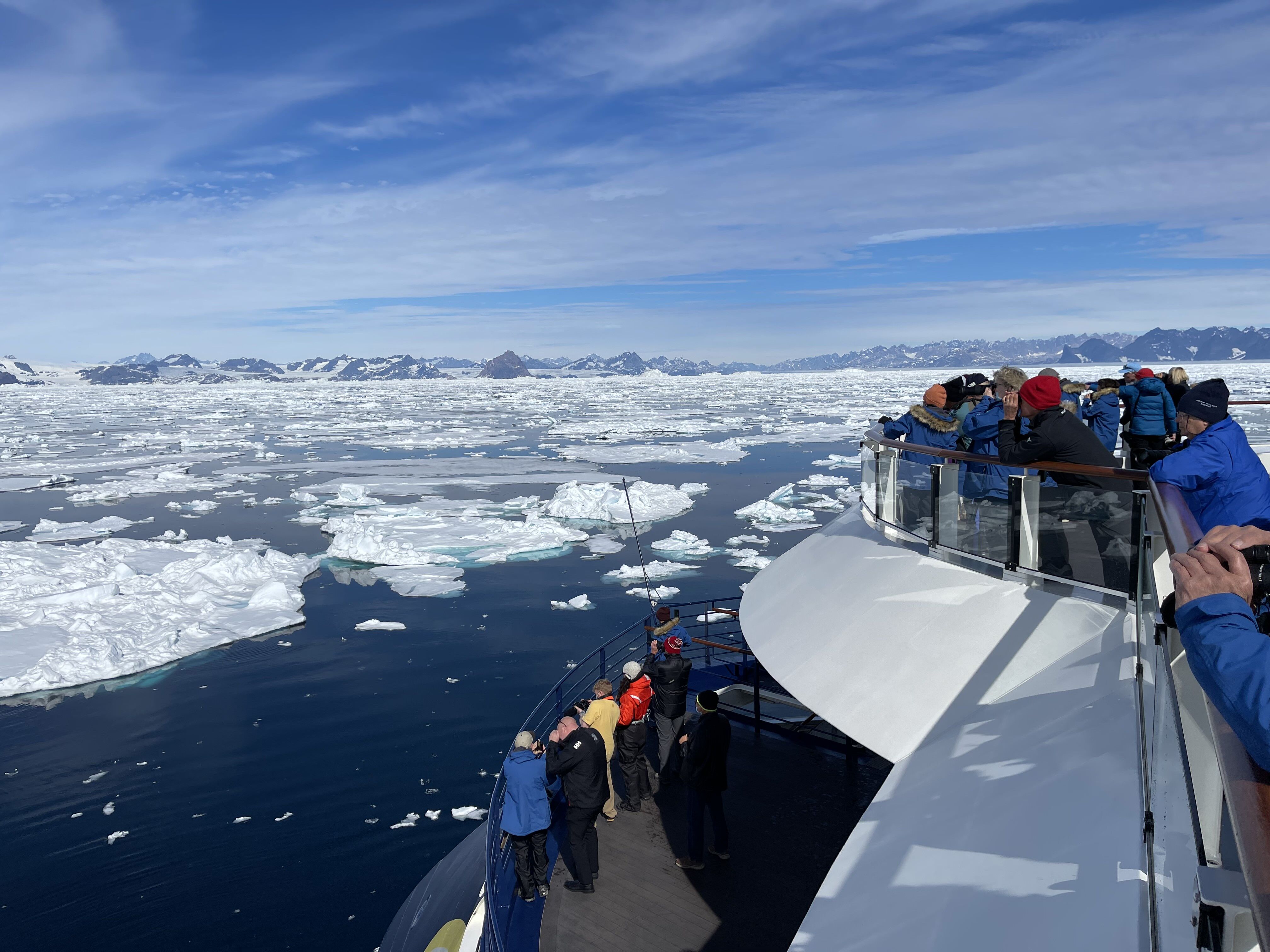When the fog finally lifted, we found ourselves surrounded by a brilliant mosaic of ice with panoramic views of the spectacularly mountainous coast that had magically materialised. We found our first icebergs and our first glaciers, and every passing moment brought new and changing vistas and entrancing views — with the stark beauty of the Arctic in every direction.