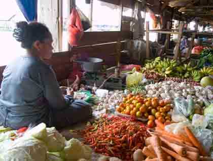 The crossing of the sandbar that has ruled our timing over the past few days, only to be undertaken at high tide, is a non-event, and we are now in the mouth of the Kumai River. Lunch is our main preoccupation while we sail the 23 miles upstream to dock in the port of Kumai where we are received like royalty by the locals.