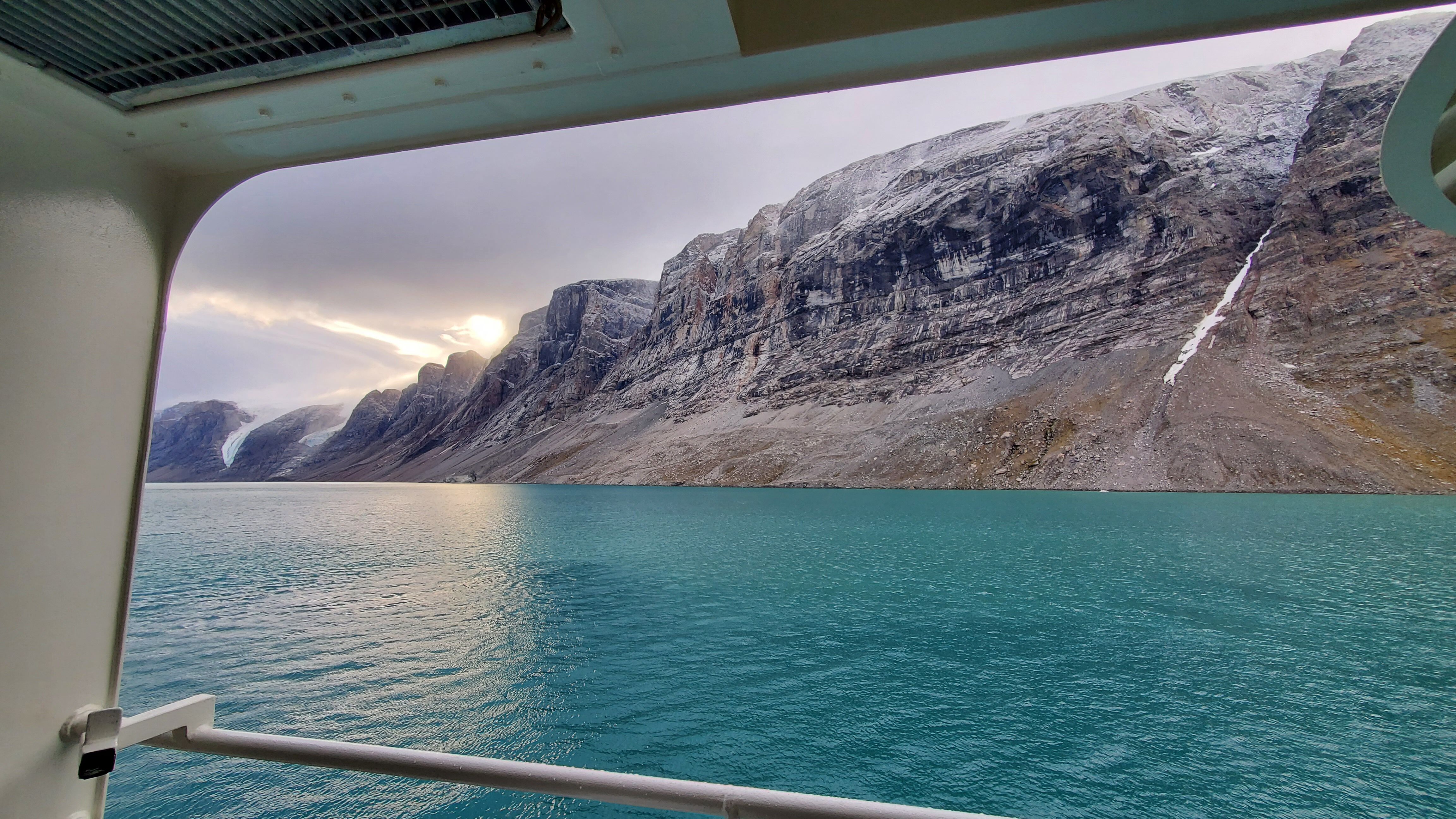Today our expedition on National Geographic Endurance took us away from Arctic Canada, and through Davis Strait as we approached our destination of Greenland. Our day was filled with fascinating and fun activities on board the ship! We started with a presentation from the Undersea Team, James Hyde and Christine West, and learned more about scuba diving in polar regions. We tried on some of the underwater gear, learned about the risks and techniques of polar scuba diving, and viewed some footage from different dives in polar regions. We then had a chance to ask both divers questions about things that are changing in our world’s oceans, which was very interesting. We enjoyed a spectacular brunch in restaurant Two Seven Zero. It was a delicious spread that included a variety of fruits and vegetables, cheeses, salads, meats, soups, potatoes, and pastries—truly something for everyone! In the afternoon, naturalist Stefano Pozzi gave an incredible talk about his year spent living in the High Arctic. Who knew talking about serious topics could be so funny? Staff and guests then gathered together to play a hilarious game of Arctic Pictionary, a game designed just for this trip. The clues for the Arctic Pictionary game included the concepts discussed during natural history presentations, places we have visited on the trip, staff members, and different types of local foods we tried on our travels. We had a blast during our day at sea, and we can’t wait to see the beautiful colors of Greenland tomorrow! Photo caption and photographer: Saying goodbye to the incredible fjords of Arctic Canada wasn’t easy, and we were out on deck watching the ice until the very last minute. What a spectacular expedition we are on! Photo by Christine Regent West