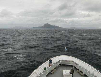 By the time we entered the Beagle Channel the sky had cleared and the wind had died completely. With a glassy sea surface ahead of us, three sei whales appeared and afforded us perfect chances for viewing and photographing these huge graceful animals. Next under the warm sun of an idyllic austral summer afternoon our galley crew barbecued sausages as an extra teatime treat around four o’clock on the aft deck.