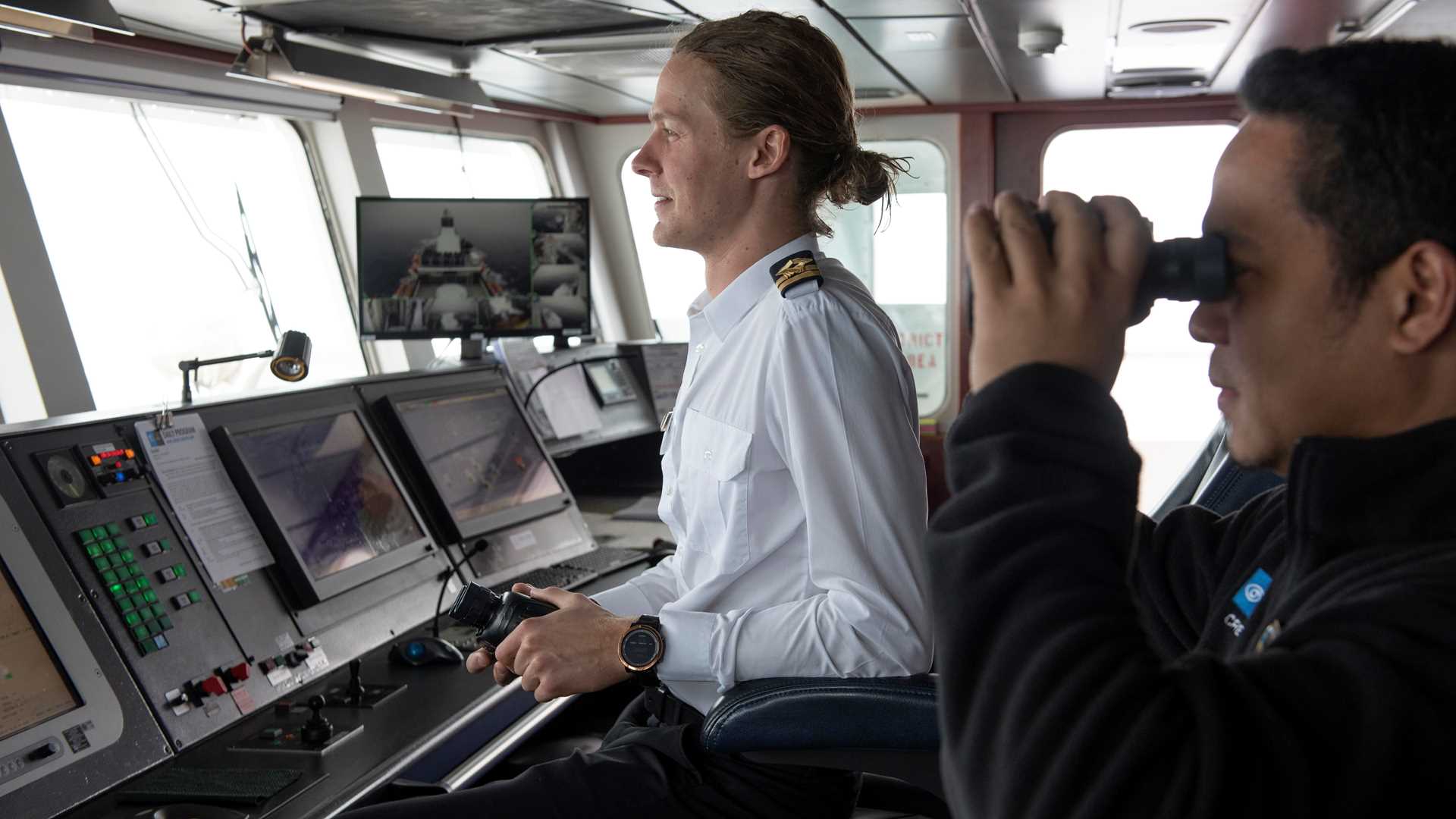 Despite the calm seas, persistent fog kept the bridge officers on their toes, monitoring with radar equipment and binoculars for stray icebergs caught up in the strong Southern Ocean currents. Many guests joined in on the bridge, learning about navigation and identifying the myriad seabirds that call the open ocean home.