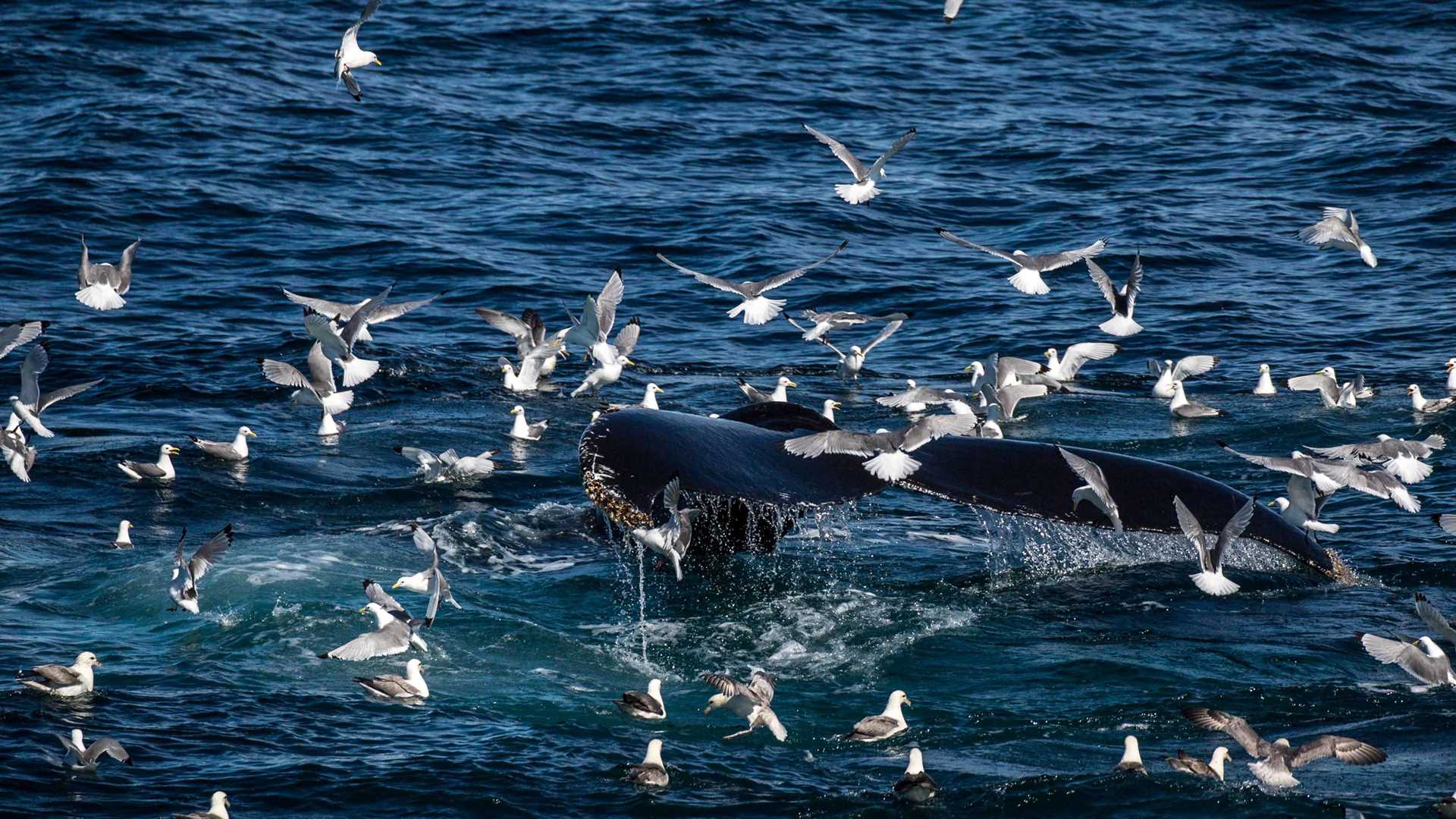 The whales put on quite a show for us. There were at least six humpback whales feeding and playing around in the waves in the shadow of the Icelandic mountains. The younger whales kept us entertained with all kinds of behaviour – slapping the surface with their fins, breeching, bubble feeding and lunging. We even saw a few whole-body jumps!