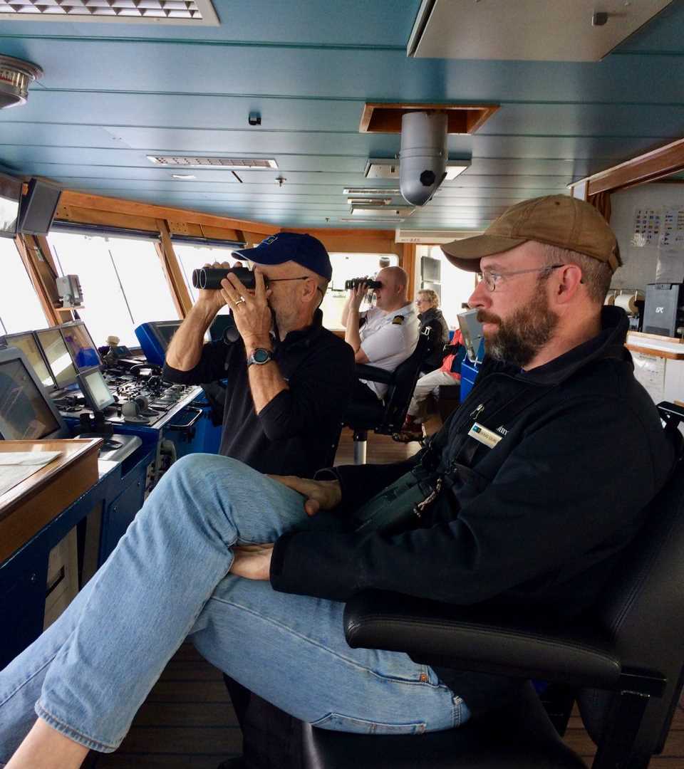 So, why do I mention all of this? It is part of at least some people’s mission on this voyage, to come to a unique place to find a rare killer whale, a race known to hunt in the zone of Convergence with its concentrated plankton and it grazers and hunters. On board we have two NOAA researchers, Bob Pittman and Jared Towers. Bob has traveled with us before, using our ships as research platforms. Both Bob and Jared are fixtures on the Bridge scanning the seas for blow or fluke marking the presence of whales, and if they are diligent and if they are lucky, we will encounter the Type D killer whale and who knows what will happen then!