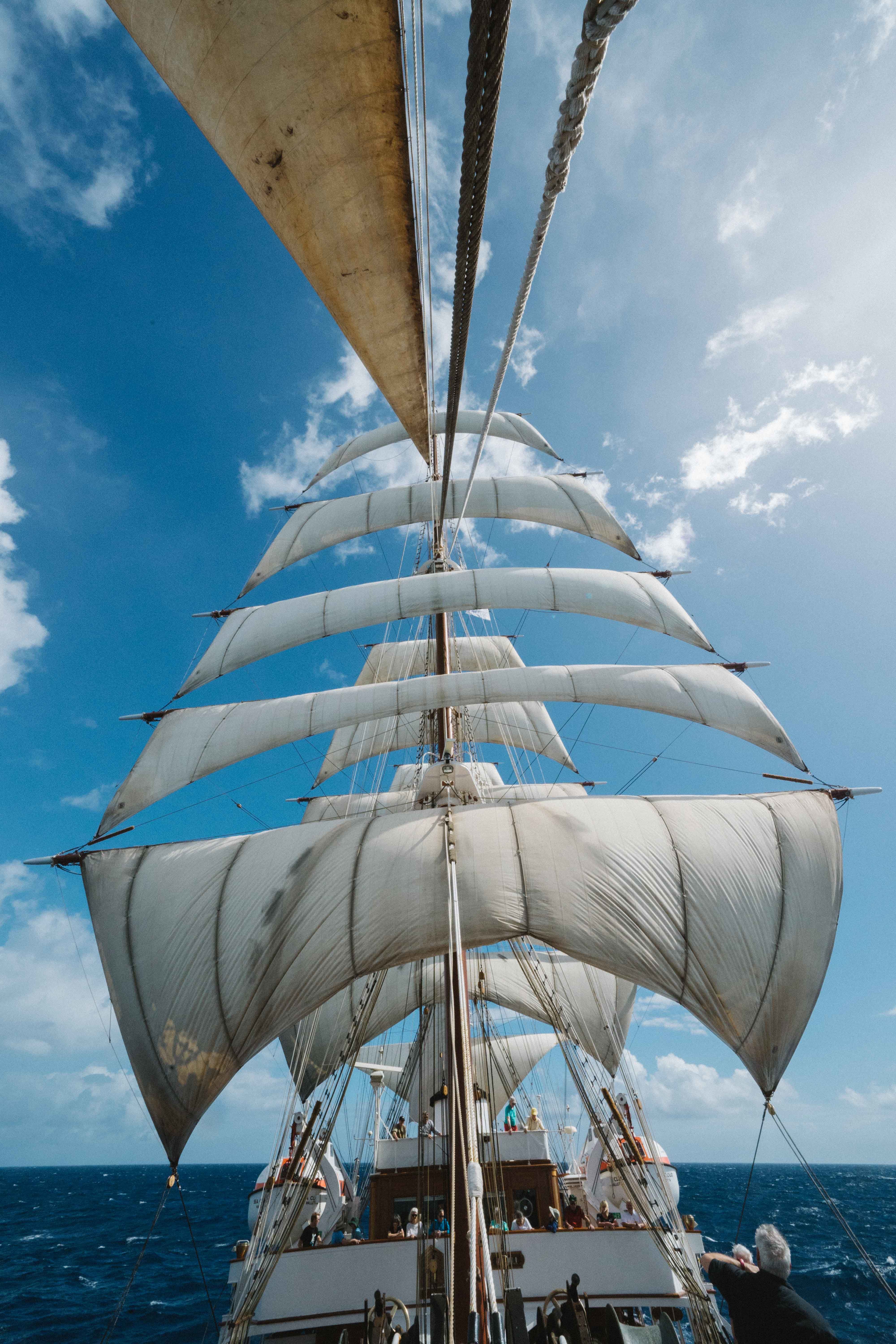 At 8:45 a.m., the expedition leader gave his informative introduction to the sails and the complex rigging of a square-rigger. Imagine a ship more than 360 feet long and displacing 2,600 tons, moving effortlessly, by wind power alone, at 8 mph. Our sails are made in Poland of a very durable, synthetic material and have an average life of about five years. Sea Cloud carries almost 28,000 square feet of sail, and its main mast is 180 feet tall Although built in 1931, it was designed to reflect the square-riggers of the 1880s.