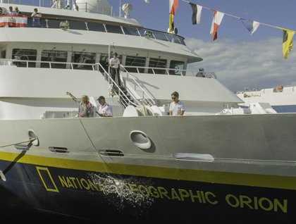 Next came the big event of the day, as we all gathered on the quayside for the traditional christening of the ship.  Captain Mike Taylor introduced our Global Perspectives Guest Speaker, Valerie Taylor, who spoke the happy words, “I christen thee National Geographic Orion!  May God bless this ship and all who sail on her!”  With a great swing she smashed a bottle of champagne on the bow, naming the vessel in honor of the great institution that will support her explorations all around the world.