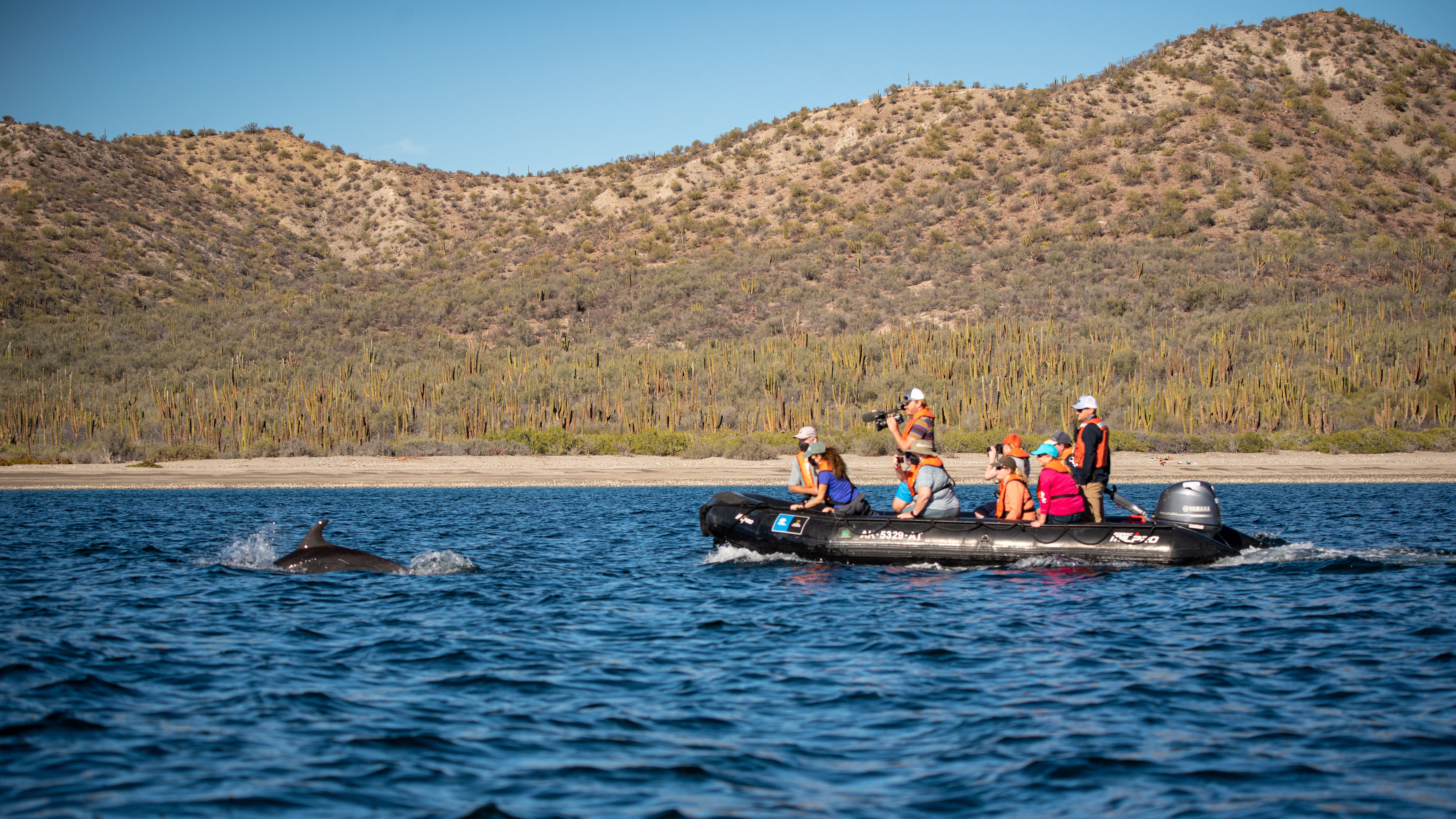 For the past five days, we have explored the theme of contrasts in the Baja peninsula. Hiking through the sparse, arid landscape of the Sonoran Desert to snorkeling in the abundant and diverse waters of the Sea of Cortez. Today, we landed at Puerto Los Gatos for a day of activities to emphasize this theme. Our morning began onshore with guided walks through the arroyos and along the bright red sandstone of the shoreline. As we discussed the geology that makes this place so desolate and otherworldly, a display offshore interrupted us: a megapod of short-beaked common dolphins surrounded the ship. We quickly took to our Zodiacs to play within the megapod and get a closer look at the dolphins. They surfed in our wake and breached out of the water around us. Later, we returned to the beach to continue our exploration of the coastline’s tide pools. We took a look underwater with guided snorkels among the coral heads and reef fish. Such an utterly magical experience between two worlds can only happen in Baja.