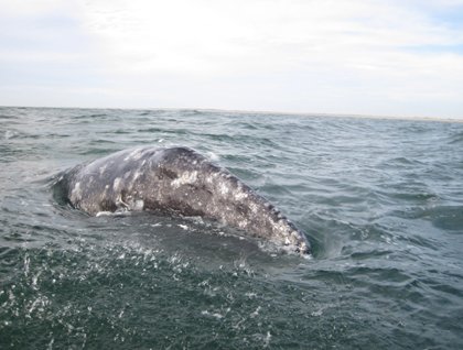 After a calm night, we awakened to the sound of a blowing gray whale. The morning was cool, and very little wind made ripples on the calm waters of Magdalena Bay. This bay is the third and southernmost locality where gray whales travel to mate and to pup their young. This is probably because of the calm waters, slightly warmer than the water in the open ocean. Even more importantly because orcas or killer whales, their principal predator, do not enter this bay. The other two localities are further north, Laguna de San Ignacio and Guerrero Negro.  This species of whale has an enormous migration route, from Mexico up north to Alaska at Behring Sea and Chuckchik Sea, where they pass the summer months, eating enormous quantities of a crustacean called amphipod, to make their blubber layer thick enough to withstand up to eight months without eating.