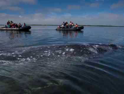 Fog! Fog! Early morning fog made us worry about the possibility of seeing the gray whales we have been seeking. But after a very short breakfast, we boarded our DIBs with our pangueros (fishermen driving pangas), and headed out to look for these huge, remarkably gentle giants in Magdalena Bay. The area around Los Titeres (the puppets) was special for us, as this is where most whales congregate at this time of year. It was a very successful morning, the whales were doing their thing, mothers swimming slowly along with their calves playing and rolling around them. Cameras clicked successfully, and the shouts of glee made the now thinner fog reverberate. Wow! Back on board we had a better breakfast, and enjoyed a talk by William about tequila, the national drink of Mexico. Immediately afterwards, the second group took off in the DIBs to enjoy the antics of the whales. Everybody on both cruises was happy and satisfied with the encounters.