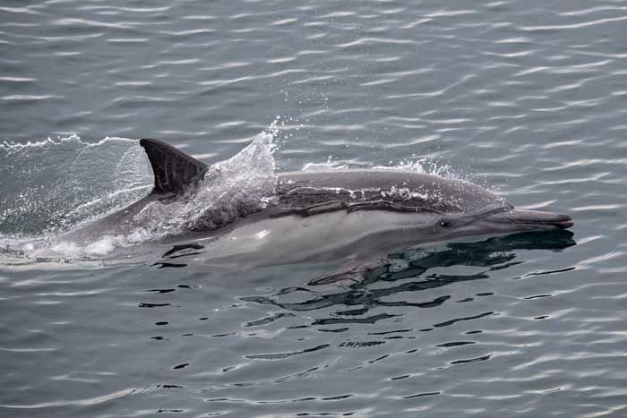 We also had the special opportunity to take a closer look at the whales from our expedition landing craft. We saw several gray whales. Some of them were singles and some of the females had a calf swimming by their side. At first, it was hard to believe we were actually that close to these gentle giants. We could see the color and texture of their skin. We could see the barnacles and “whale lice” that cover part of their bodies, and we could see, hear, and even smell their impressive blows! For a while, bottlenose dolphins got really close to our boats as well, and they appeared to be playing with a mother and calf pair of whales.