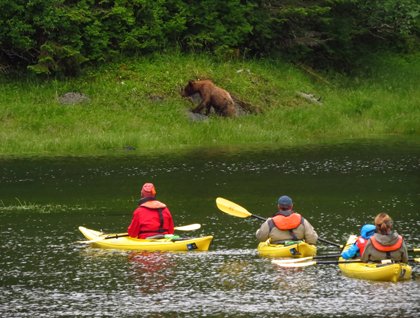 Lake Eva became our afternoon playground. Kayaking and a variety of walks kept us busy, but the lovely brown bear walking the edge of the back lagoon kept us enthralled. As kayakers admired the lovely falls created by the stream from Lake Eva, a brown bear was spotted. This bear could not have been more cooperative for viewing as it skirted the shoreline, crossed the lagoon in the shallows, came up the trail where one hiking group was admiring it, crossed back to the shoreline, swam across the lagoon, and then continued along the edge of the forest, eating blueberries from the bushes as it finished its clockwise circuit of the inner lagoon. Kayakers just spun in little kayak donut circles to watch the whole show.
