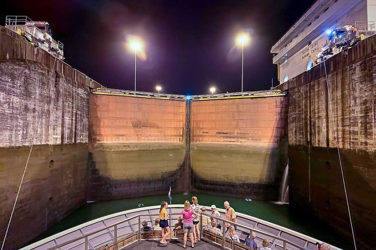 The sunrise at the middle section of Panama Canal was a spectacular way to start our morning. The sounds of mantled howler monkeys and yellow-throated toucans were part of the melody going on at Barro Colorado. Barro Colorado is critical for research in the area, and scientists from all over the world come to study the numerious species that call this island home. It is held as one of the best studied tropical rainforests in the world, led by the Smithsonian Tropical Research Institute since 1923. The trails show not only a great biodiversity of flora and fauna but also a complex of small laboratories and sampling sites in the field. We learn about stingerless bees, bats, and the incredibly industrious life of ants occupying the tree canopy. A second group around the island on Zodiacs. The shore of the islands is equally rich with wildlife, and the group managed to spot several crocodiles and birds. The morning went fast, and we now wait for our Panama Canal Pilot to complete our transit.
