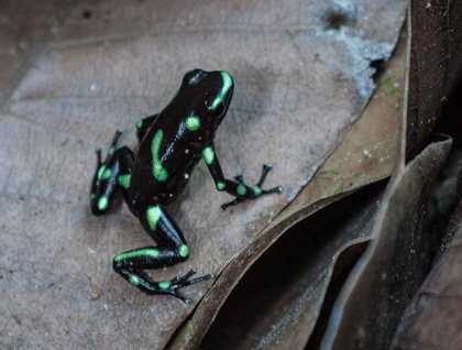 After his presentations, we grabbed our gear and went to explore two trails on the island while or take an inflatable cruise around the island. The presence of wildlife did not let us down. Crested guans, red-capped manakins, slaty-tailed trogons, troops of howler monkeys, agoutis and many others animals delighted us during our visit. What really caught the attention of our guests was a tiny black and green dart frog that tried to hide under the leaf litter.