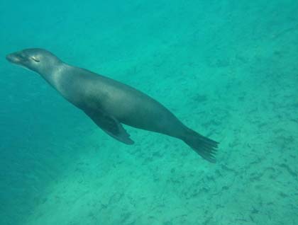 After returning to the ship for breakfast, we set out again. This time we went to a small golden-colored beach, where we snorkeled with penguins, rays, and different species of fish. We also took our glass-bottom boat for a ride along the coast of this nice calm bay and saw just as much as the snorkelers did.