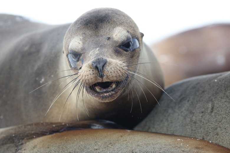 After lunch, our ship navigated to an island known as Chinese Hat, where our guests had the chance to go swimming. This was a great excursion, as the water was clear and the conditions were excellent. Everyone who snorkeled there was thrilled by all the different species of fish found in this area. Later on and after snorkeling, we returned once more to go for a Zodiac ride along the coast of Santiago Island and Chinese Hat Islet; the light was great for photography and there were some sightings of Galapagos sea lions resting on the rocks, brown Pelicans soaring the sky and a beautiful sunset behind the titan volcanoes of Isabela island in the far distance.