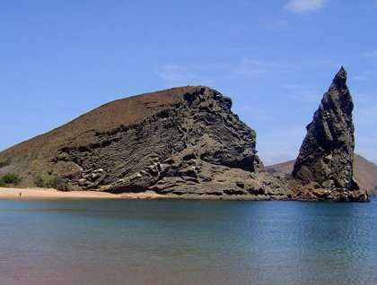At the top, the view is breathtaking! Two golden beaches opposite one another, green mangrove forest vegetation in the narrow center, the famous Pinnacle Rock and the island of Santiago looming in the background. It is a game of colors and contrast, out of an immense dark and relatively new lava flow, cones of different sizes stand out in beige, brown and red colors.