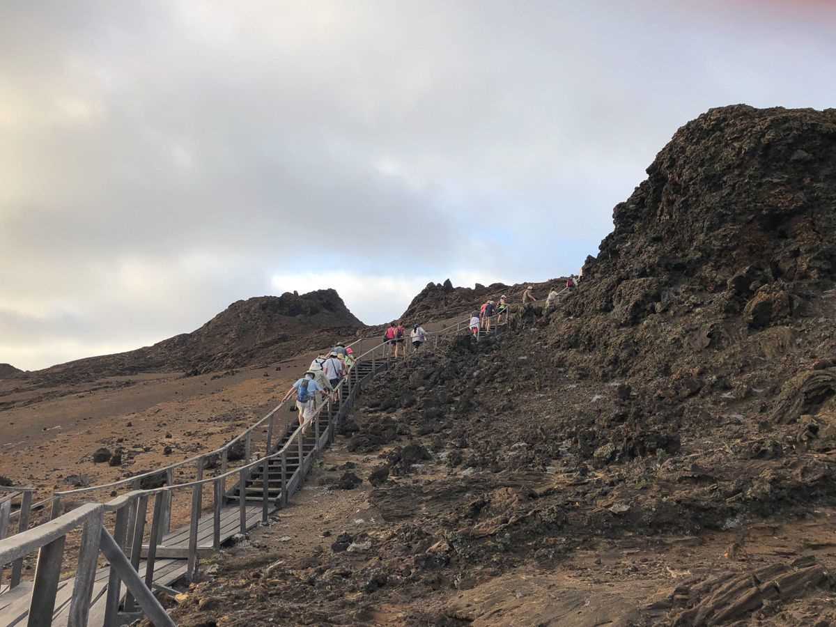 After watching a gorgeous sunrise from the lounge with an early morning coffee in hand accompanied by delicious zucchini bread, we headed off at 6:15 am in the Zodiacs, passing iconic Pinnacle Rock towards Bartolome, a satellite islet of Santiago Island. We walked uphill along a wooded staircase passed different geological formations such as tuff and spatter cones, plus the darker basaltic lava flows that cover this relatively young island. Lava lizards scurried around the tiquilia nesiotica and lava cactus. These pioneer plants, those first to establish themselves on the barren lava islands, give us a glimpse of how life started in the Galapagos Archipelago.
