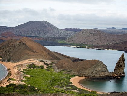 We had a spectacular first full day in the Enchanted Islands! I woke the guests at 6:00 a.m. for coffee, fruit and apple bread in the lounge. By 6:30 a.m. we were loading three Zodiacs for the climb to the summit of Bartolome with our naturalists Walter, Greg and Jan. We followed a boardwalk and wooden steps past cinder and spatter cones, and small lava tubes and from the top we had a fabulous view of the extensive lava flow on Santiago that dates from 1897. The contrasting golden and white sand beaches, reddish cinder cones, barren black lava fields, green mangrove thicket and the blue ocean made for some lovely photo opportunities!