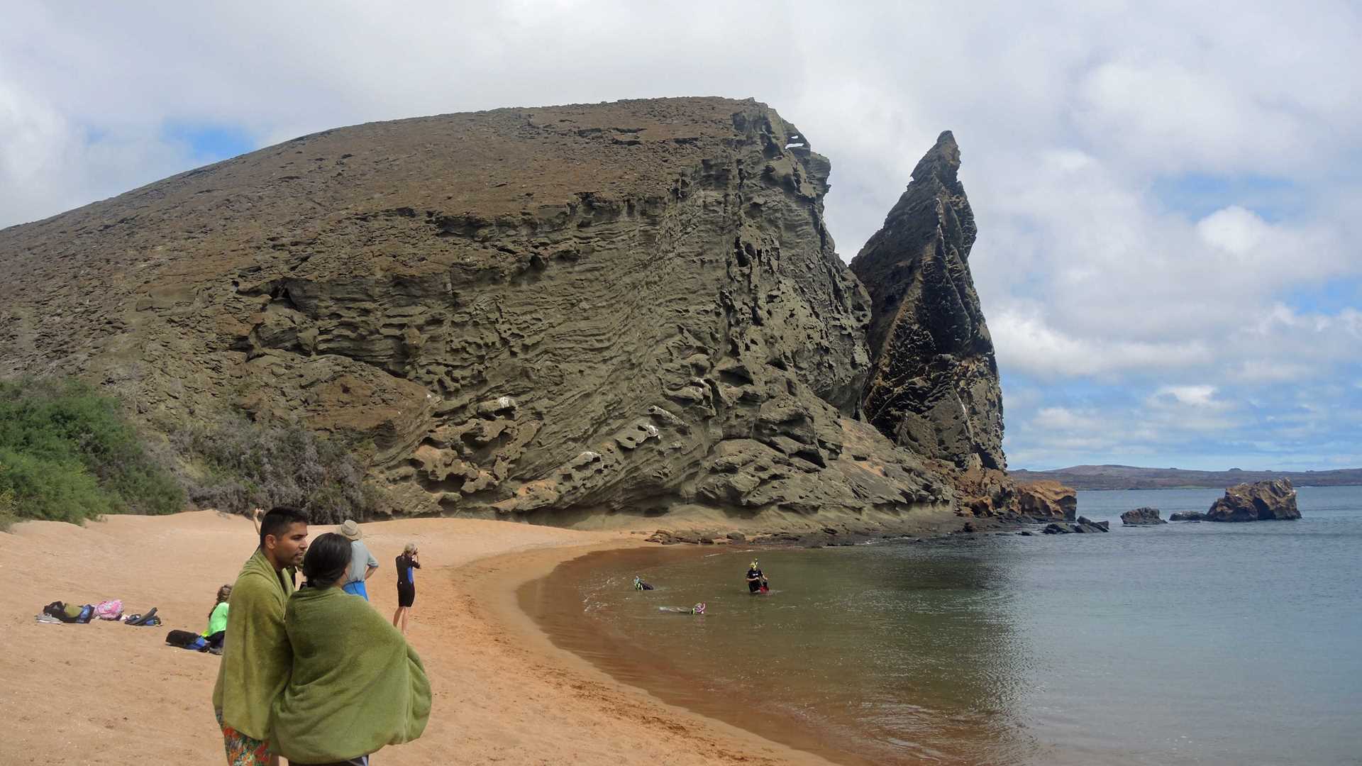 On the second day of our trip, we took an early walk on Bartolomé, a small islet located at the east of Santiago Island. Walking on this trail is like visiting another planet! Volcanic shapes, craters, lava rocks, and some other geological features reminded us of distant places such as the moon or even Mars. Few plants and animals live here, but the landscape is so impressive that one could spend the whole day admiring all the details. Once we reached the highest point at Bartolomé, we could see one of the most emblematic landscapes of the Galápagos, Bartolomé’s pinnacle with its two beautiful beaches. We were also able to see part of James Island with its intricate black pahoehoe lava designs.