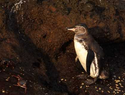 In the afternoon we motored to Sombrero Chino Islet, off the coast of the large island of Santiago. Alongside a massive young lava flow, we had a second opportunity to snorkel today. The underwater world here is quite varied, from small damselfishes to parrot fishes, puffers and more white-tipped reef sharks. The unique marine iguanas, the only true sea-going lizard in the world and endemic to the Galapagos archipelago, feeds here, as well as some fast-swimming Galapagos penguins that came by, too busy hunting their prey to pay attention to us. After snorkeling, we returned on board. Then some of us went for a zodiac ride along the rocky shore; we could photograph the wildlife and at the same time we enjoyed the amazing volcanic landscapes while clouds turned orange and reddish giving us a very special and unforgettable feeling!