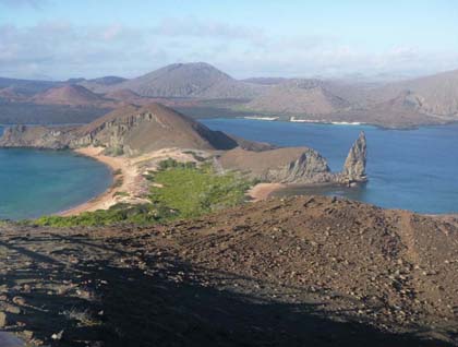Today we started our day anchored near the southeast corner of Santiago Island, next to one of the most emblematic places of Galápagos: Bartolomé Island. Our first outing took place early in the morning with the sun rising behind the spectacular cinder and tuff formation of Bartolomé. The light was perfect for taking pictures of the landscape. On our way to the summit we learned about the geology of the place, which is surrounded by different kinds of parasitic cones and lava tubes—it was a great experience. From the top of the island we were able to recognize more than 10 different islands.