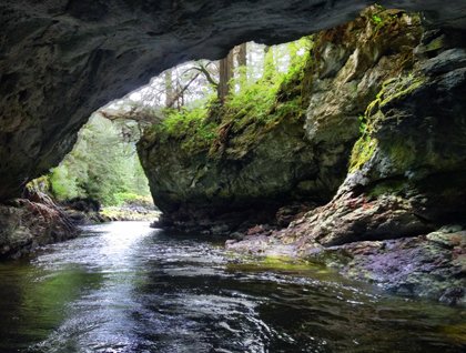 Waiting for the tide to fill up the bay, so that we could access the small stream that pours down from a nearby lake, guests and staff from the expedition explored the intertidal area and forest margins by foot. Some kayaked the choppy waters in search of adventure. As it rose, the tide made the entry to a nearby limestone grotto easier by boat. So late in the morning we were off once again in expedition landing craft.