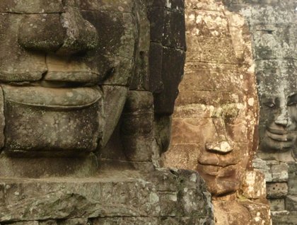 It takes time to see the order in the chaos of Bayon. From a distance the lichen painted sandstone seemed all in disarray. Giant blocks with fragments of figures waited like a massive jigsaw puzzle yet to be tackled and solved. With each passing moment, little-by-little, fragments fell into place. Four roads converged. Bayon is the center of Angkor Thom. The orientation does make sense. Two concentric galleries in a compact rectangle tell the history of the past. Bas-reliefs, as intricate or maybe even more so than those of Angkor Wat, record the lives of the people from a thousand years ago. A military procession, a naval battle, the flora and fauna of the time are all recorded here for those who take the time to stop and look. Faces stared back. No corner or direction could be found where the bodisattva could not see us. Fifty-four towers with four faces each, watch in the each of the cardinal directions.