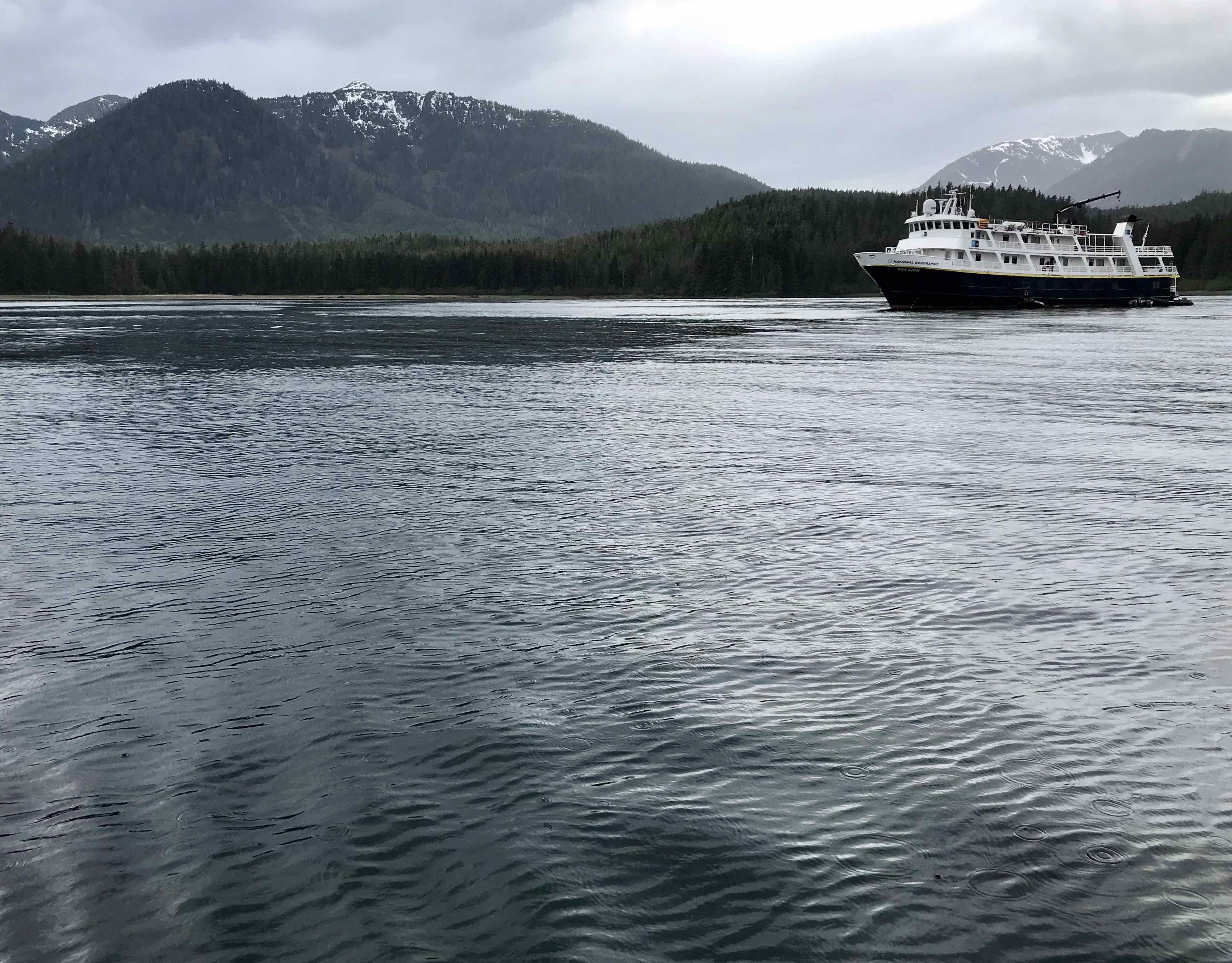 After sailing from Haida Gwaii, we reentered U.S. waters and arrived at the northern boundary of Dixon Entrance. The mist and clouds from the day before were gone and we were treated to sunshine on the water as we began our journey in Southeast Alaska. We soon spotted a solitary humpback whale feeding near the shore of a small cove. The whale surface fed for a while, then began slapping its tail on the surface. Some speculate that this is a learned behavior that possibly stuns the whale’s fish prey. After having our fill of the whale, we continued east into Behm Canal, through Owl Pass and the cliff face that gives the pass its name, and into the heart of Misty Fjords National Monument. We set anchor at the head of the canal and spent the afternoon kayaking the quiet bay and shoreline. While guests relaxed on deck with drinks and hors d’oeuvres before dinner, a few staff headed out by expedition landing craft to deploy the remote-operated vehicle into the sea below the Owl Pass rock face.